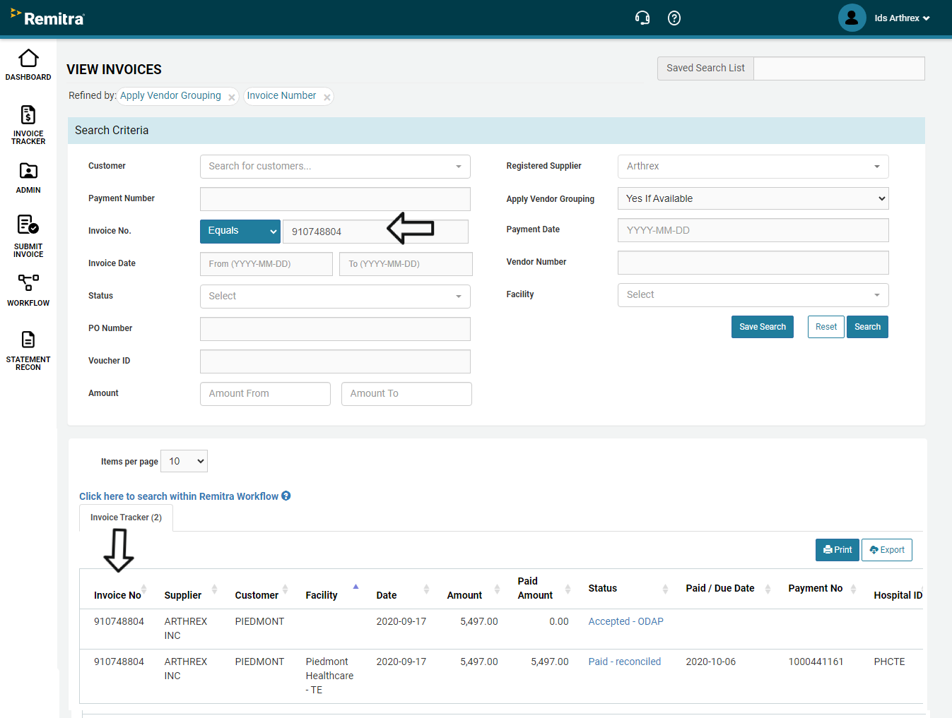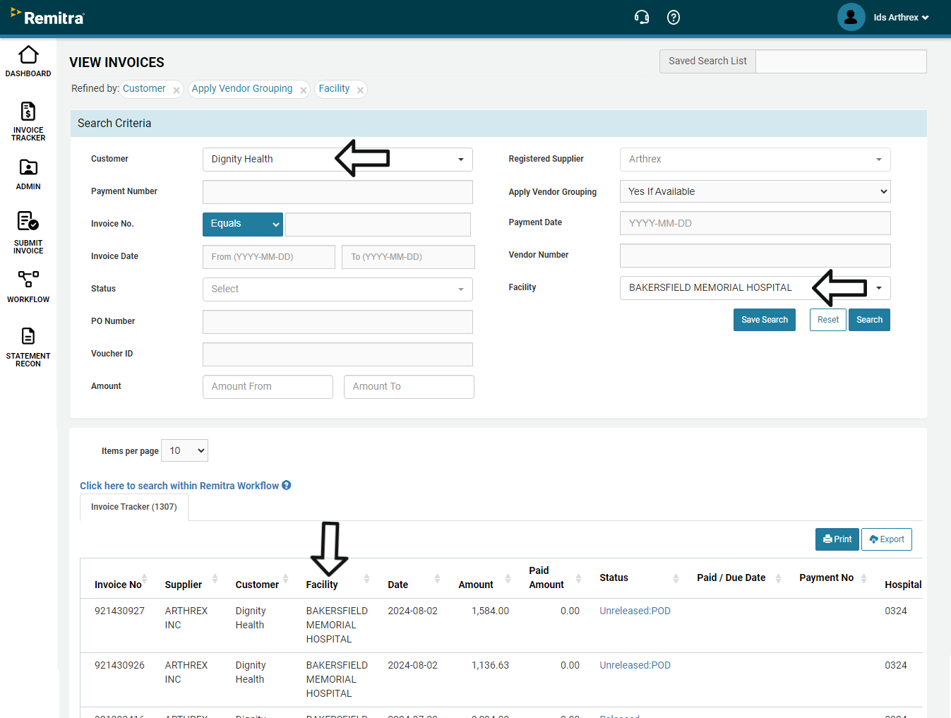 A supplier can view the total number of outstanding invoices (in brackets) at each facility. Then a supplier can drill down by facility or invoice number or a date range.