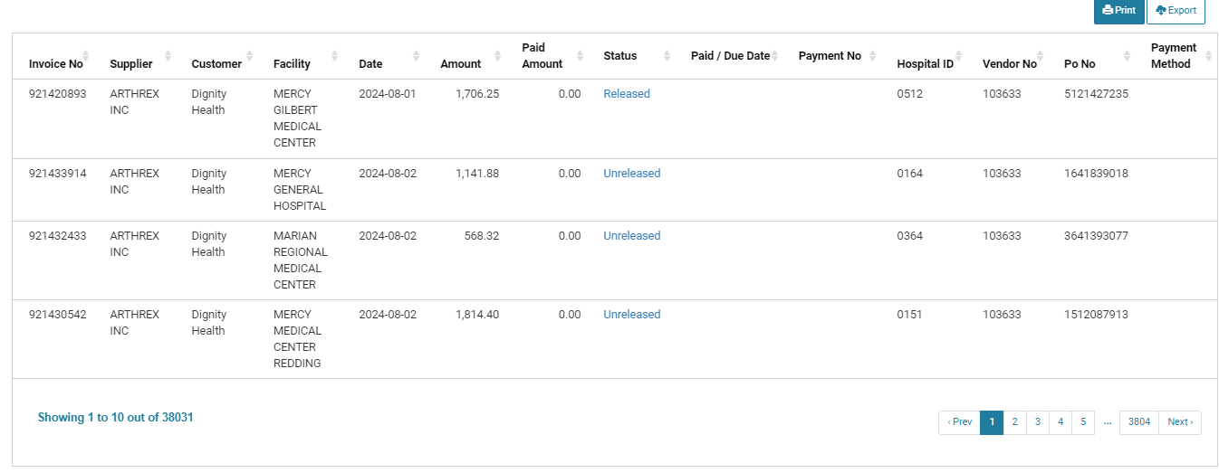 - Suppliers may view their invoices, at one time, across all their hospitals that participate in the service.