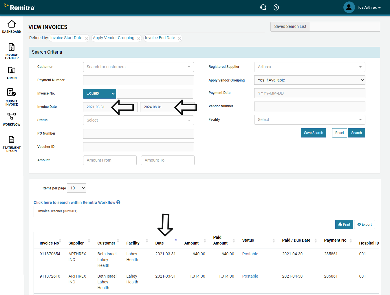 Search For Invoices based on Invoice Date within a specific date range